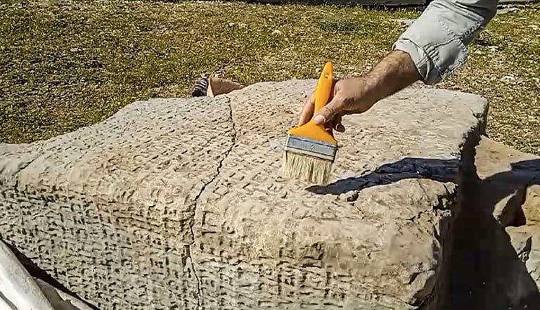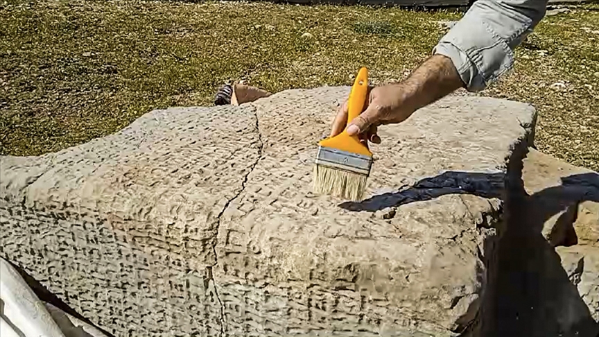 Adıyaman'ın Gerger ilçesinde bulunan ve askeri helikopterle sarp kayalıklardan alınarak Perre Antik Kenti'ne taşınan 2100 yıllık yazıtta çeviri çalışmaları yapılıyor.